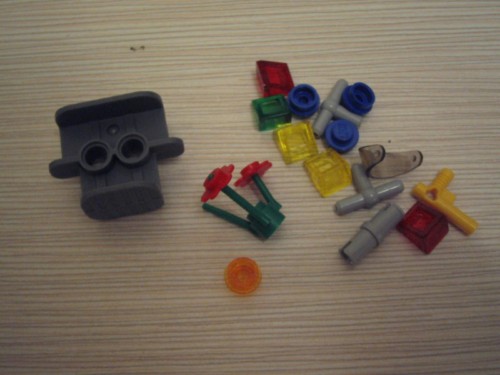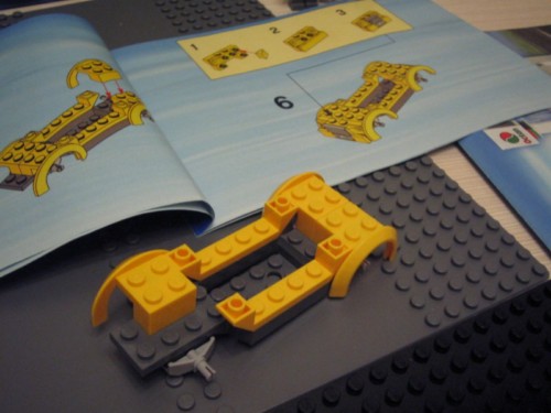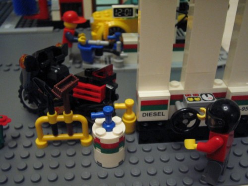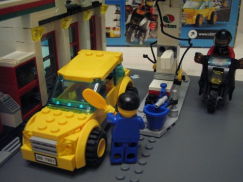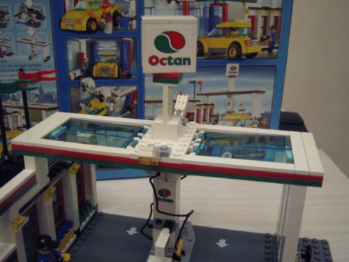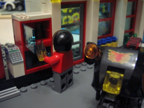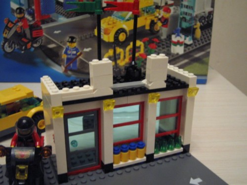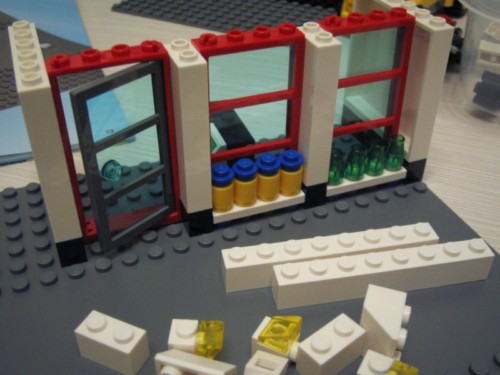 接著開始動手興建油站, 這應該是店舖, 玻璃窗前有汽水及飲料。另外注意那塊門框, 是灰色的, 真奇怪, 盒面所示的應該是紅色的。莫非是錯體版?? Lego 開始像啟記積木那樣貨不對辦了 @@